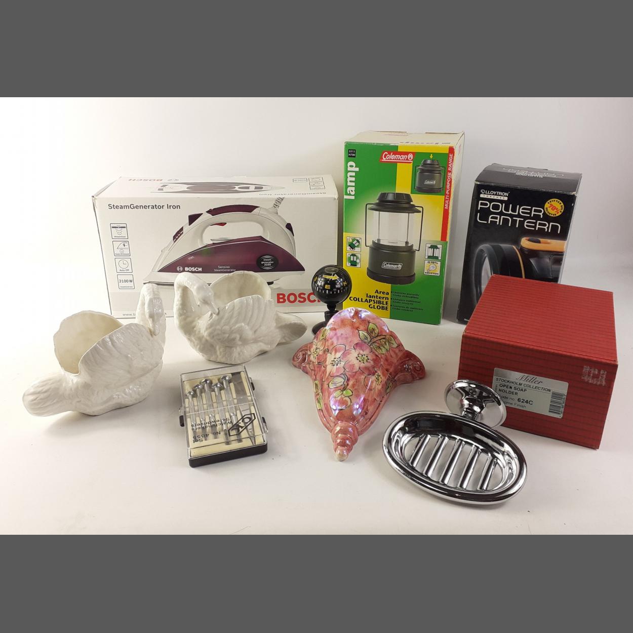 Be ready for power cuts - or camping trips with these battery powered lamps - a COLEMAN area lantern with collapsible globe and a LLOYTRON power lantern plus a boxed open soap holder, a boxed 3100W BOSCH steam generator iron, a pair of ceramic swans, a set of watchmaker's screwdrivers and a KENSINGTON WARE floral lustre wall-mounted posy vase (20cm long)