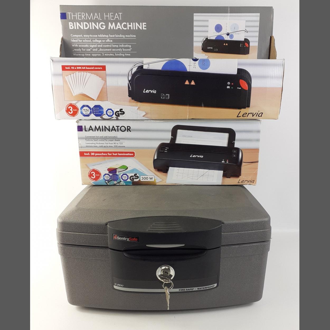 A boxed LERVIA thermal heat binding machine, a boxed LERVIA A4 laminator and an H2100 sentry safe