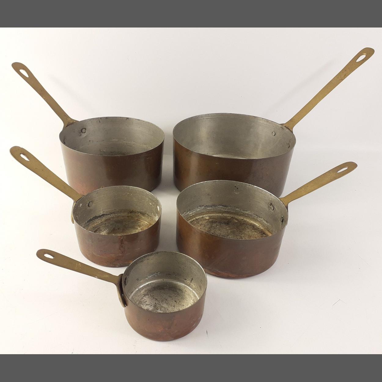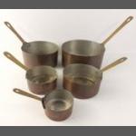 A set of five vintage copper pans with tin lining and brass handles, ranging from 17cm down to 7cm diameter