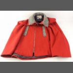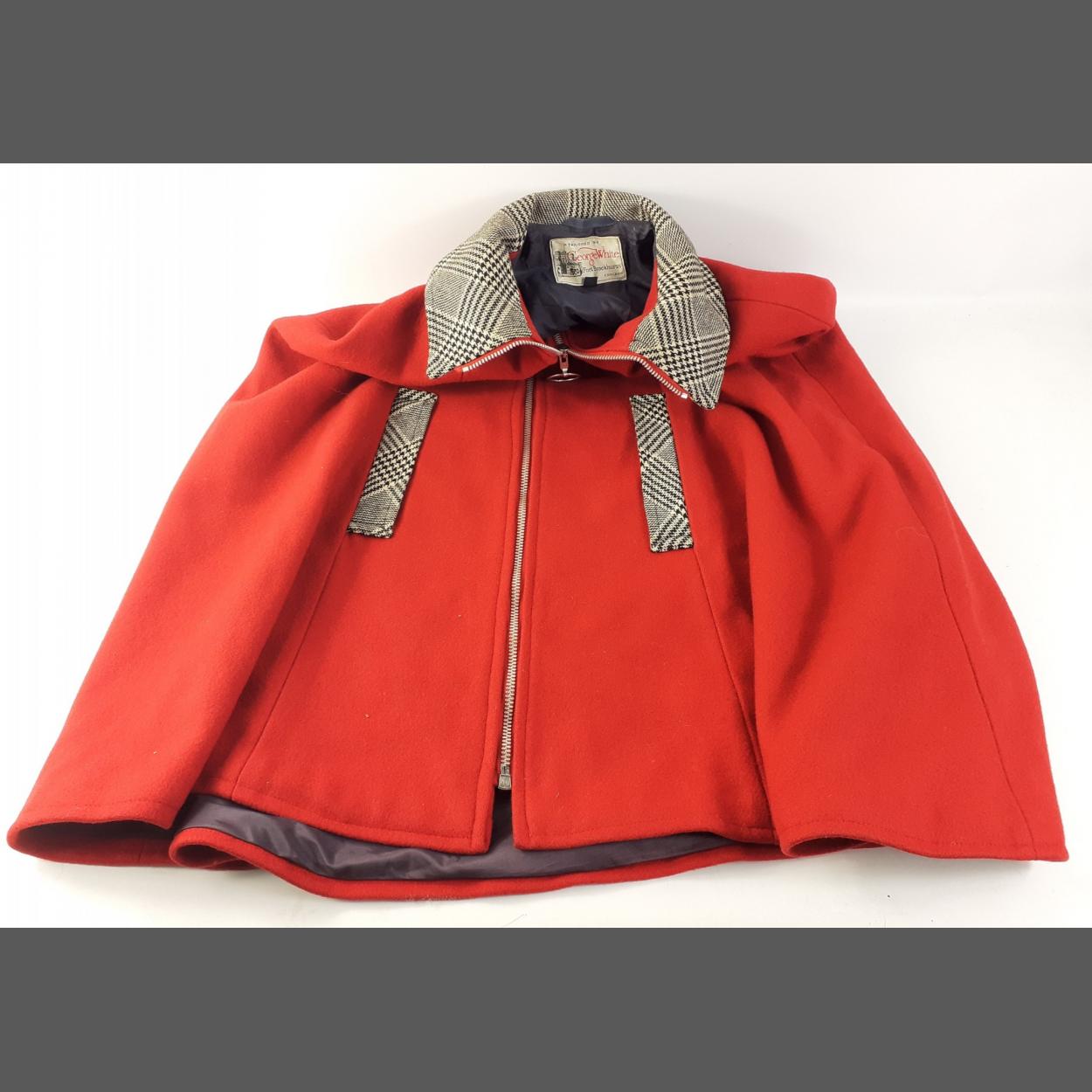A vintage size 10, zip-up cape in red wool with houndstooth collar and pocket trim and blue lining, length 75cm approx, tailored by GEORGE WHITE, Fort Brockhurst