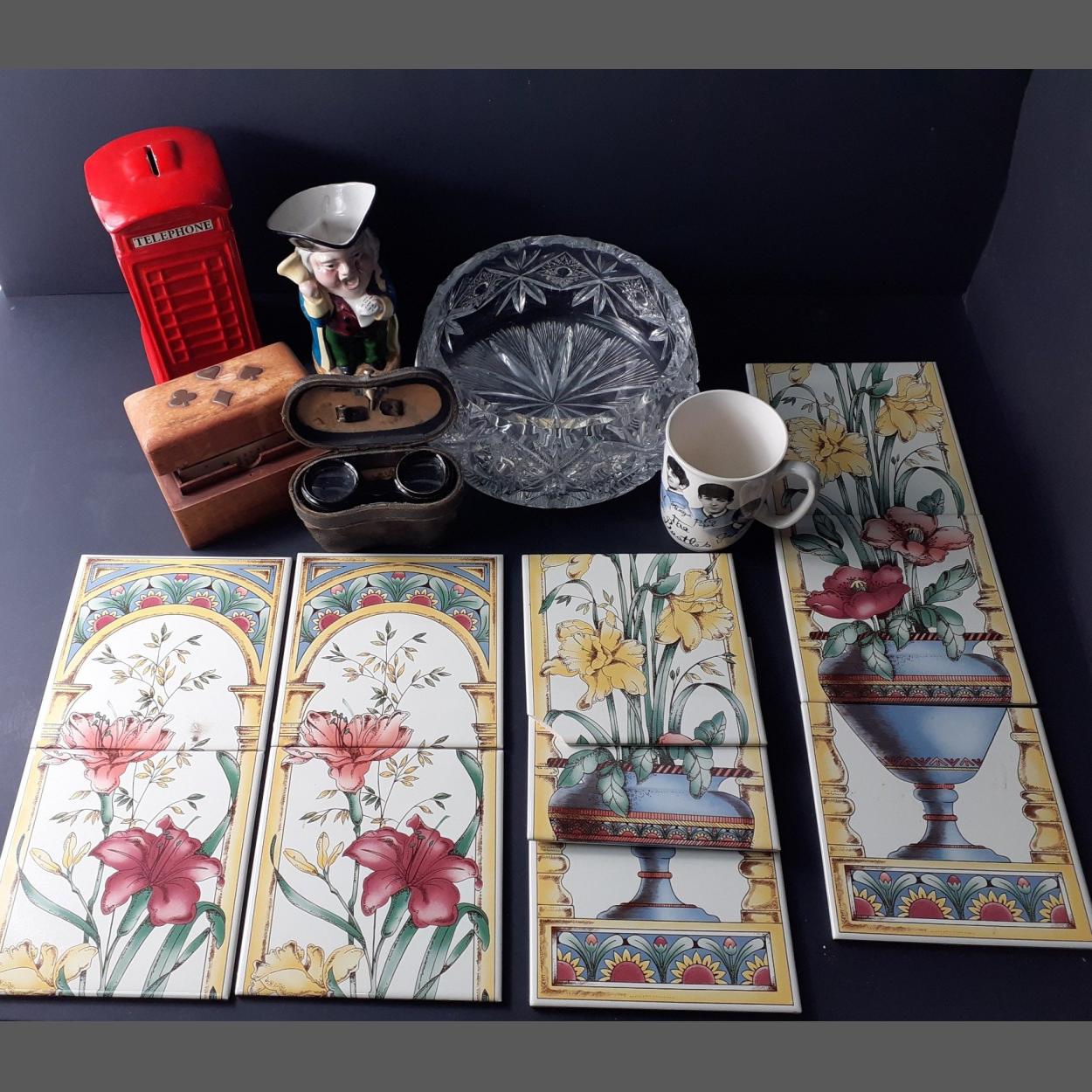 A mixed box to include a crystal fruit bowl 20cm diameter, a ceramic red telephone box money box, a wooden box with 2 sets of playing cards, 10 ceramic tiles 15 x 15cm, a pair of opera glasses, a Staffordshire fine ceramics toby jug, a Beatles mug,