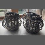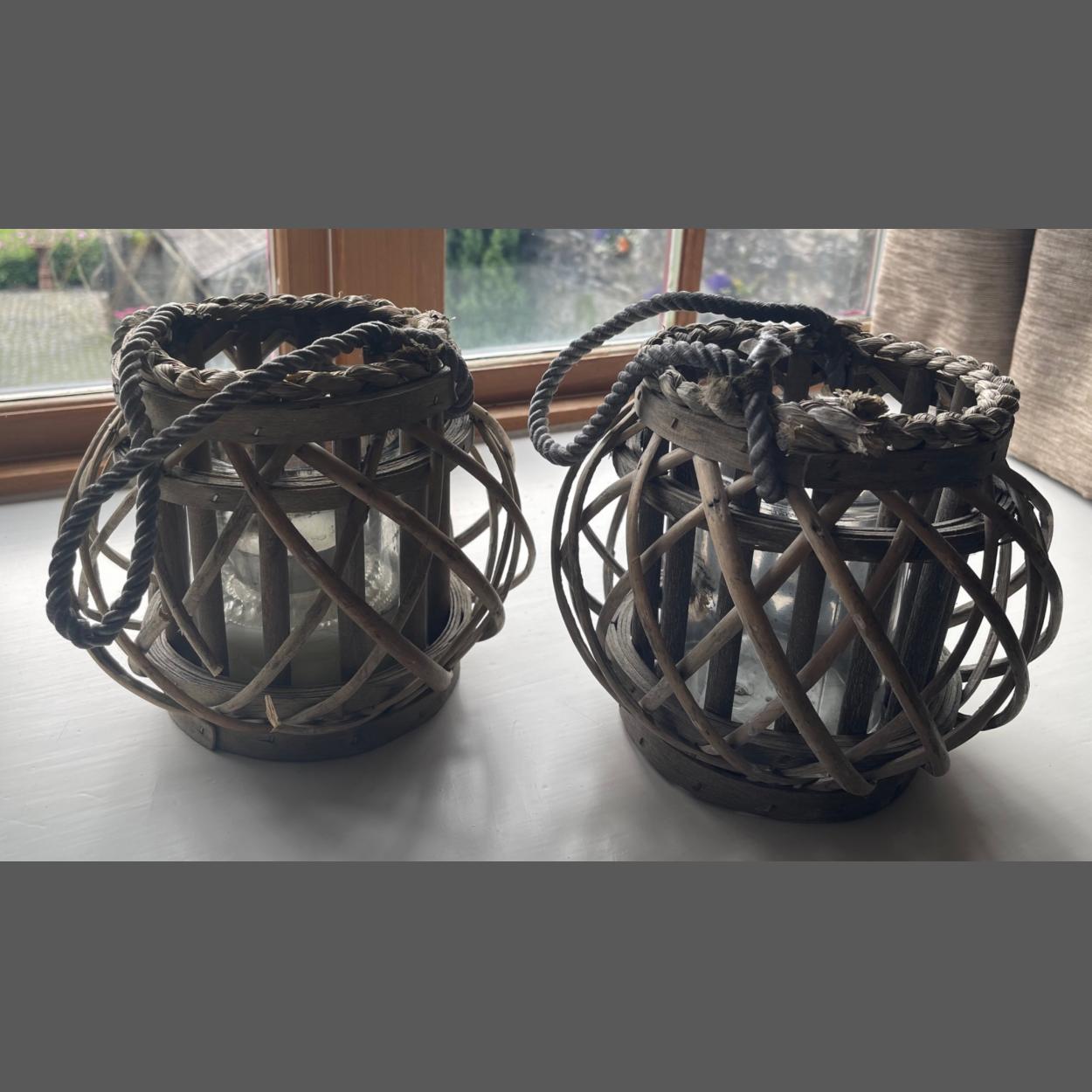 A pair of fashion basket candle holders with glass candle holder inserts - dimensions each 18cm tall x 14cm diameter approx