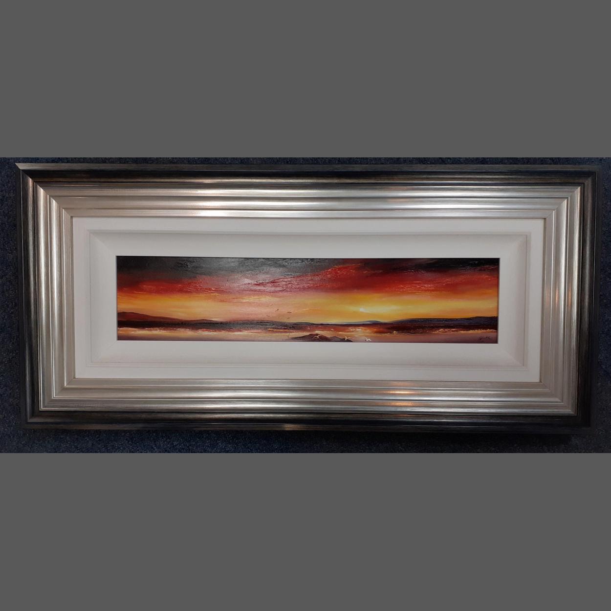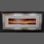 An ORIGINAL ACRYLIC PAINTING by LILIAS BLACKIE of an atmospheric coastal scene with beautiful yellow, orange and red colour palette. Frame measures approx. 93cm in length x 43cm in height. Visible work measures approx. 64cm in length x 14cm in height.