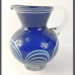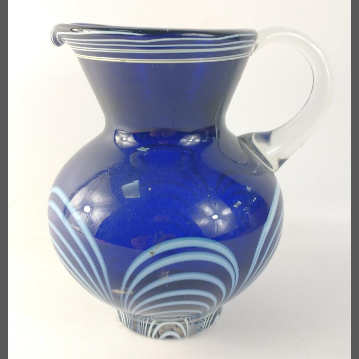 A very attractive cobalt blue glass blown water jug in balloon shape with lovely white stripes. Unmarked but of good quality. Stands 19cm tall and 19cm wide. In good condition with no chips, cracks etc. .