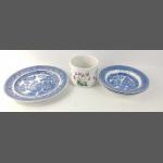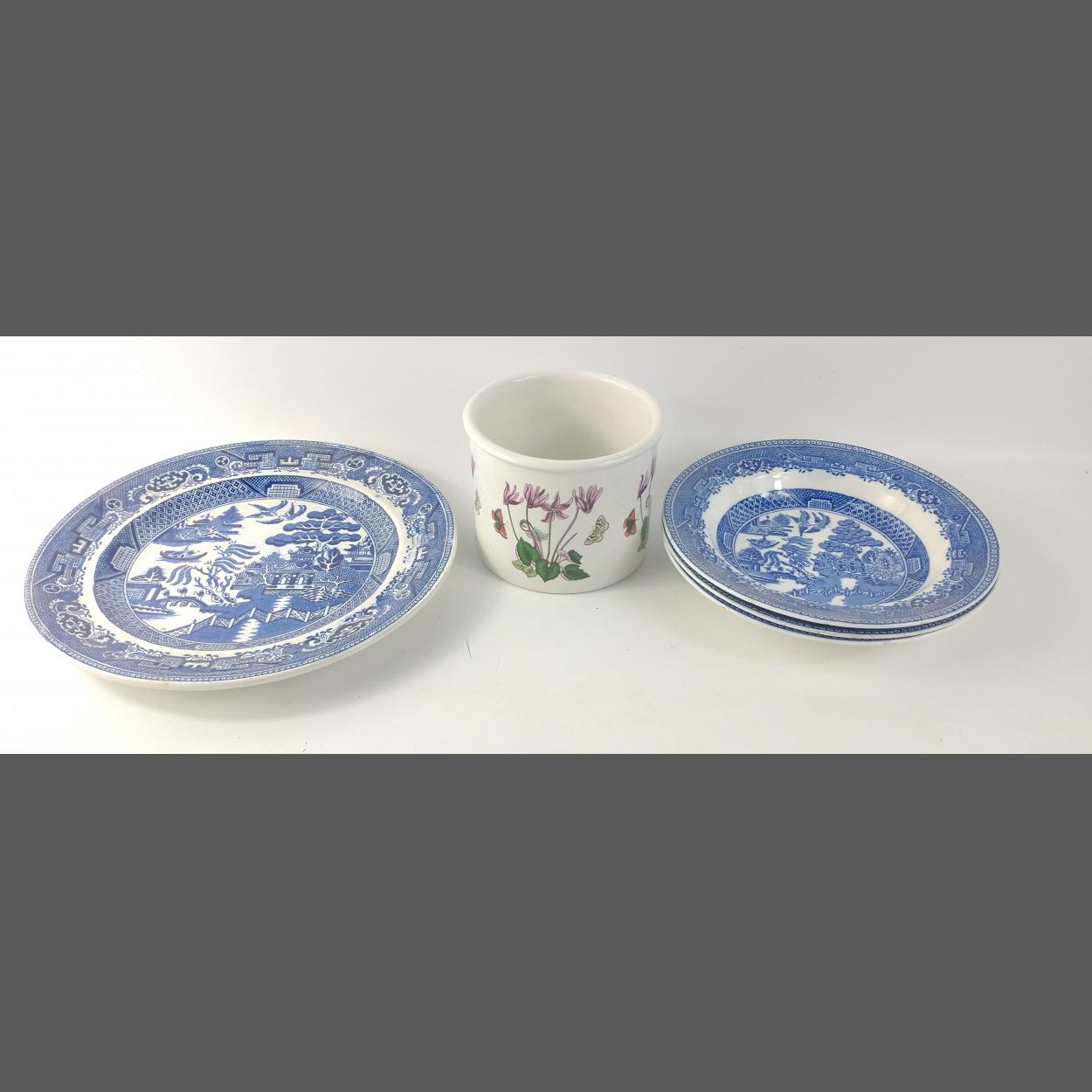 A PORTMEIRION plant holder 13cm dia 10cm high, plus three VICTORIA PORCELAIN soup bowls and one dinner plate in the blue willow pattern