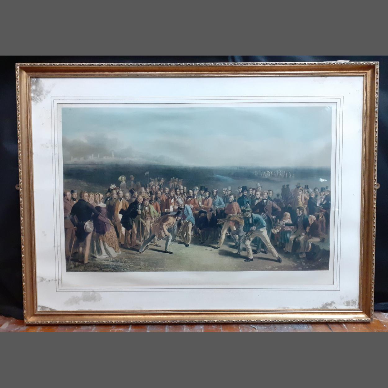 JUST OUT OF STORAGE! - A large framed print of THE GOLFERS by CHARLES LEES RSA. Subtitled 'A Grand Match Played Over St Andrews Links' Sir David Baird of Newbyth and Sir Ralph Anstruther of Balcaskie, and their opponents: Major Hugh Lyon Playfair of St. Andrews and John Campbell of Glensadde frame size 112cm x 83cm, picture size 86 x 53cm printed Edinburgh Dec 20th 1850 published by Alexander Hill print seller to the Queen 67 Princes Street. There is some fading to the border.