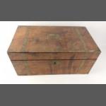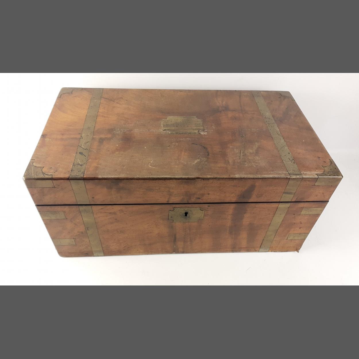 A 19th century wooden writing slope with brass banding and escutcheon. The interior of the box is in need of TLC, measures 45x25x25cm