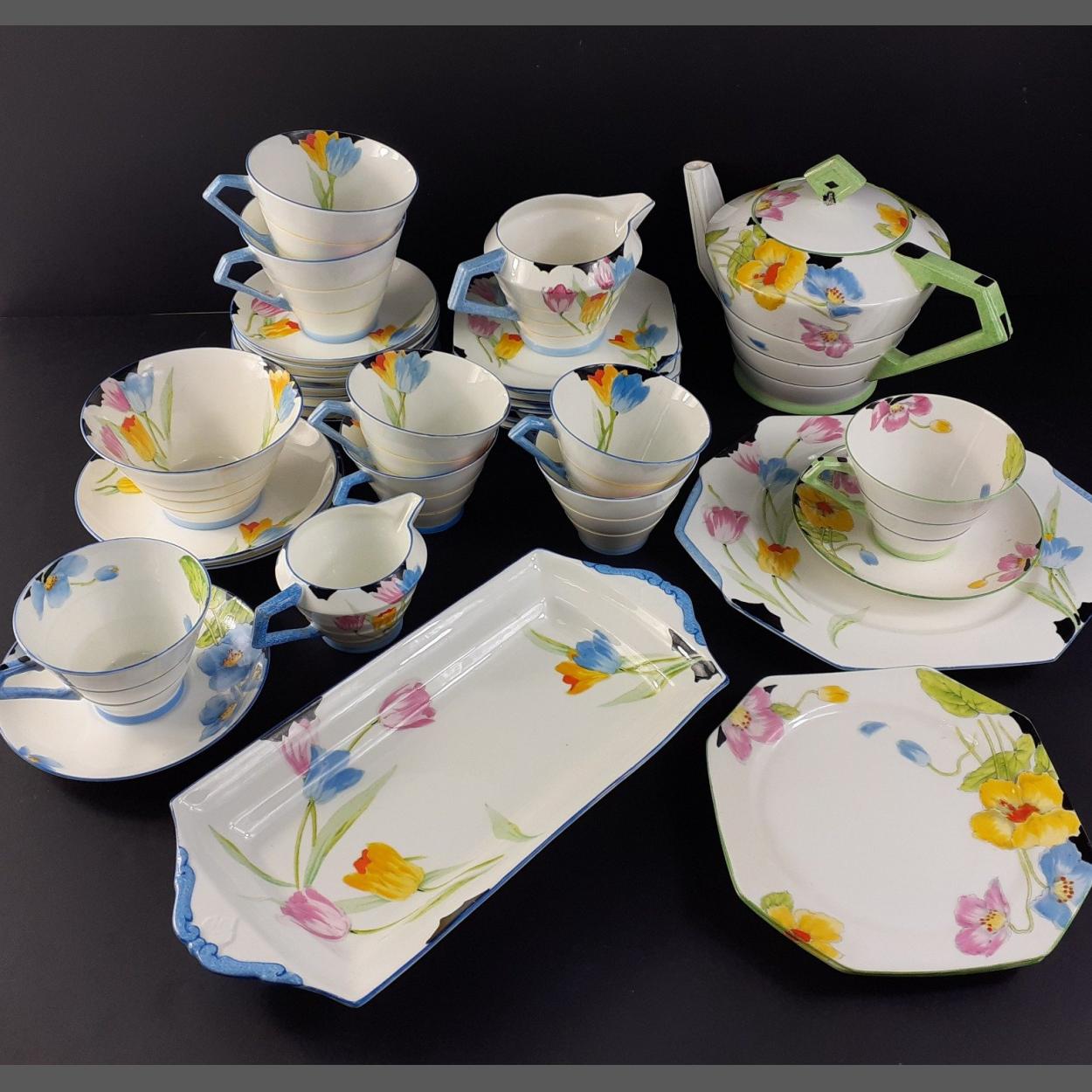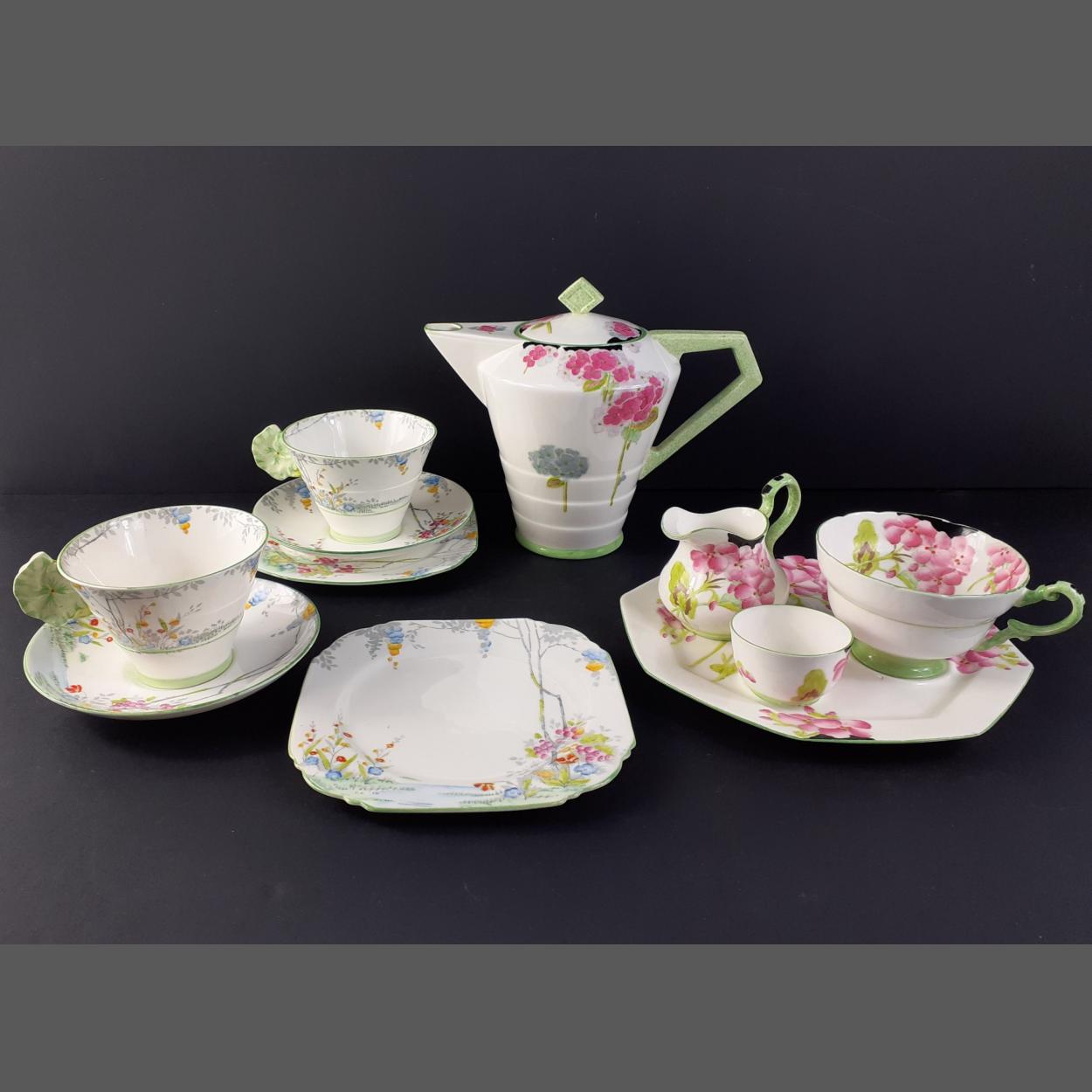 C1930's PARAGON - A most unusual PARAGON (made for WYLIE HILL & Co of Glasgow), 'Geranium' pattern hexagonal plate with inbuilt rests for a milk jug, sugar bowl and cup with matching hand-painted coffee pot plus two PARAGON c1930's Riverside pattern trios. NB Teapot has historical crack and one cup has a crack.
