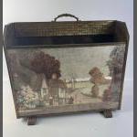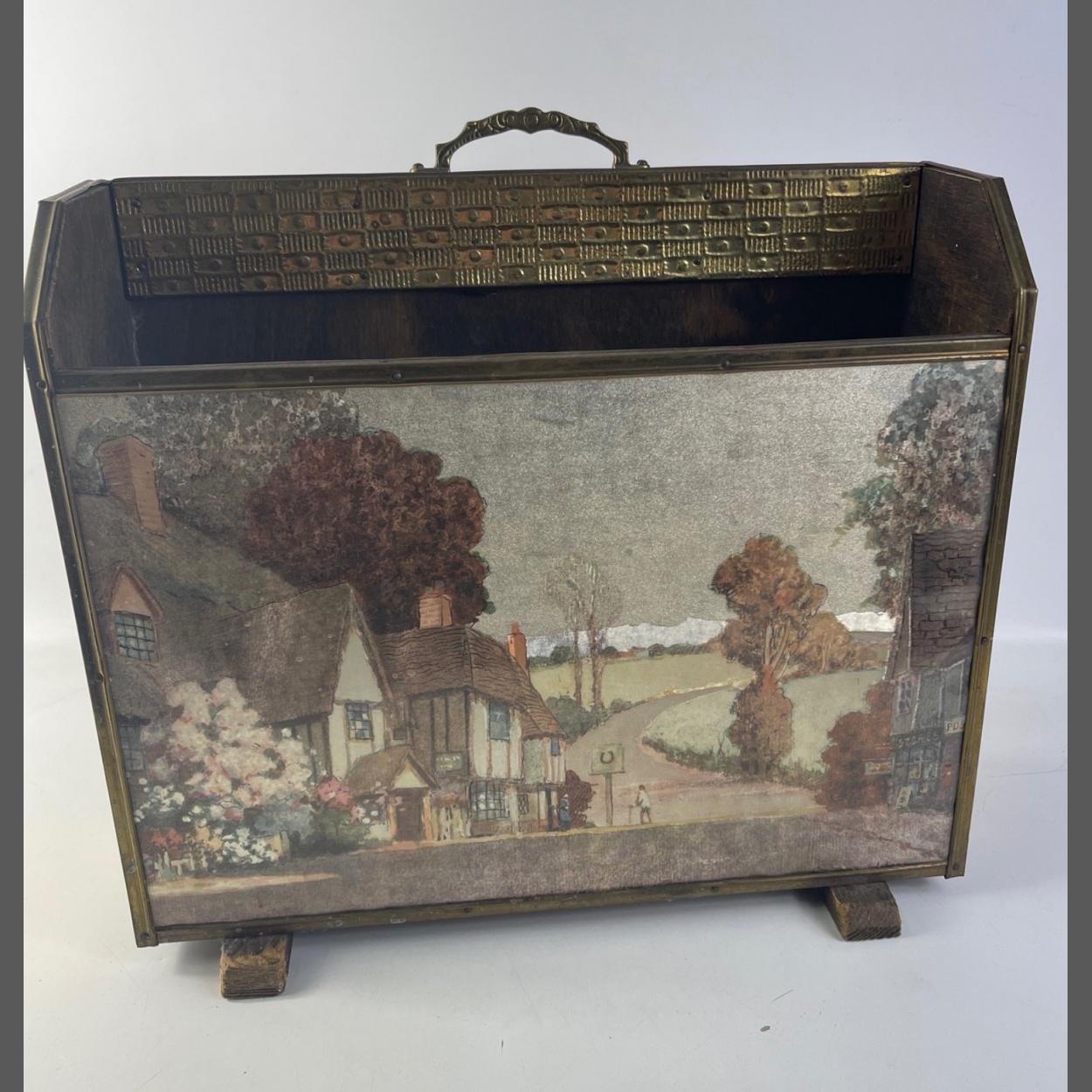 A VINTAGE brass magazine rack with a country scene on the front panel - dimensions 40cm width x 14cm depth x 34cm height approx