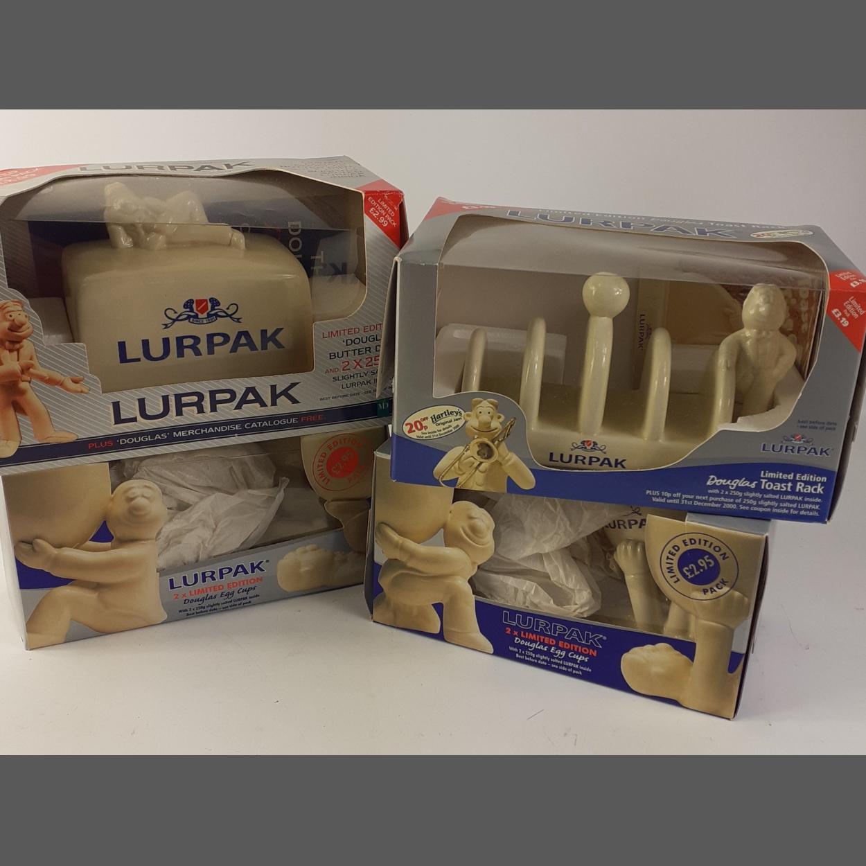 A collection of LURPAK limited edition merchandise to include a boxed 'Douglas' butter dish, a boxed 'Douglas' toast rack, and 2 'Douglas' boxed egg cups - pack 1 and pack 2. All in boxes which have been opened.