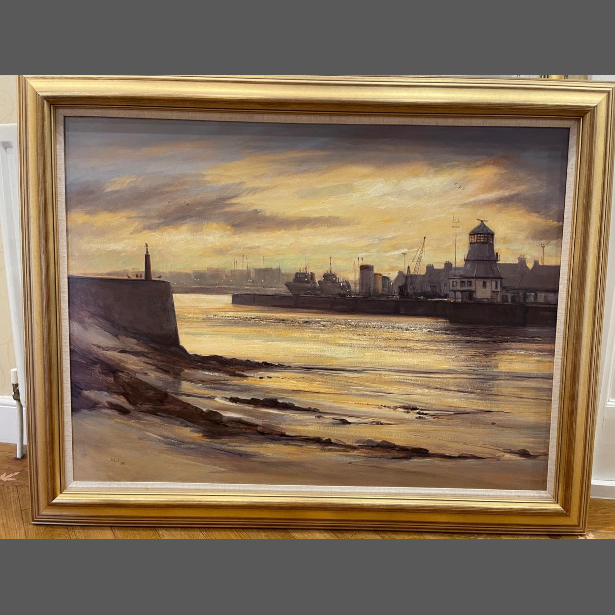 ABERDEEN ART INTEREST! Artist ERIC AULD 'ABERDEEN HARBOUR EVENING 1989 large framed canvas signed bottom left hand corner - dimensions of the frame 42" x 37" approx