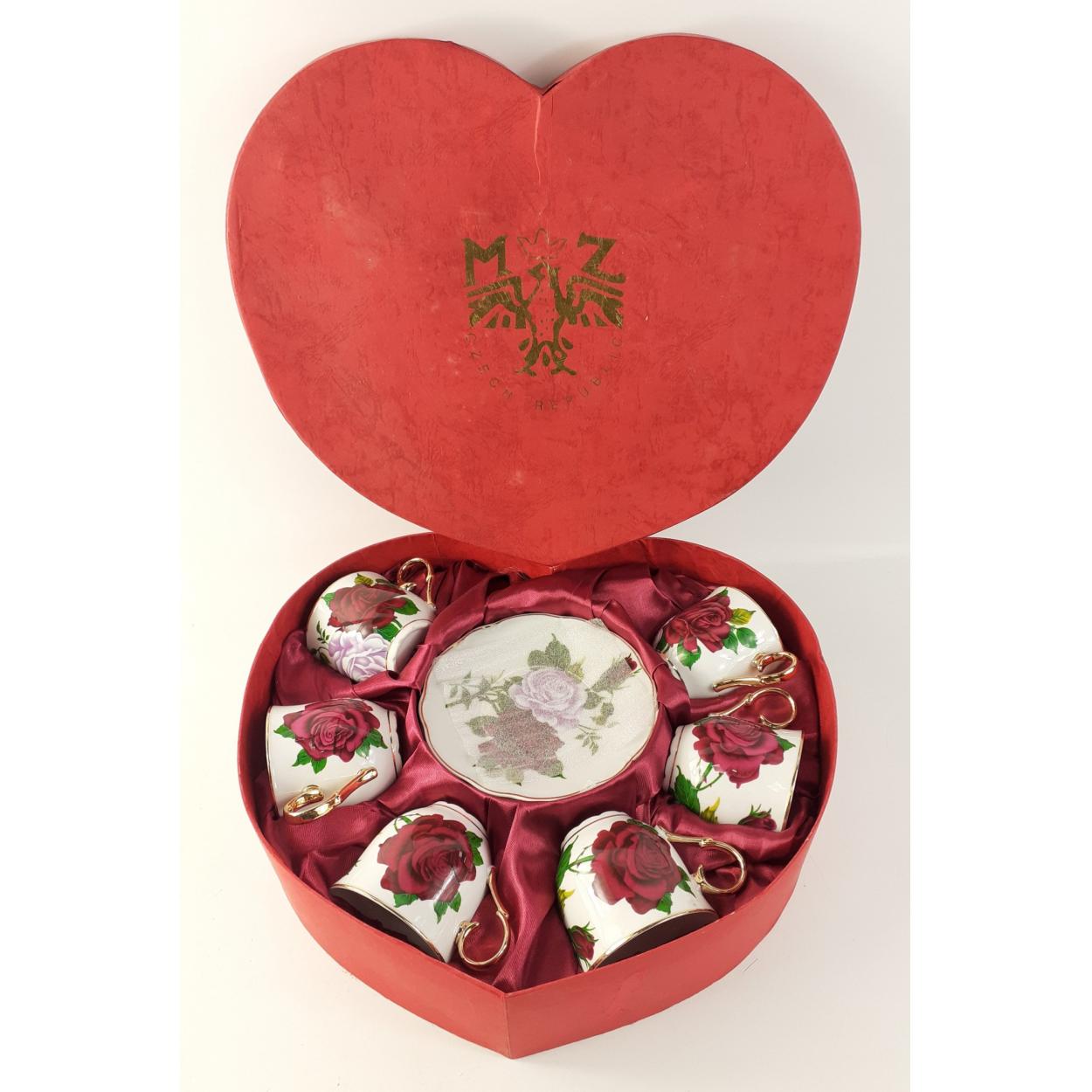 Pretty quality CZECH REPUBLIC rose decorated six place tea cup and saucer set in heart shaped box. Nice condition, no rubbing to gilt, no chips or cracks. A nicely presented set.