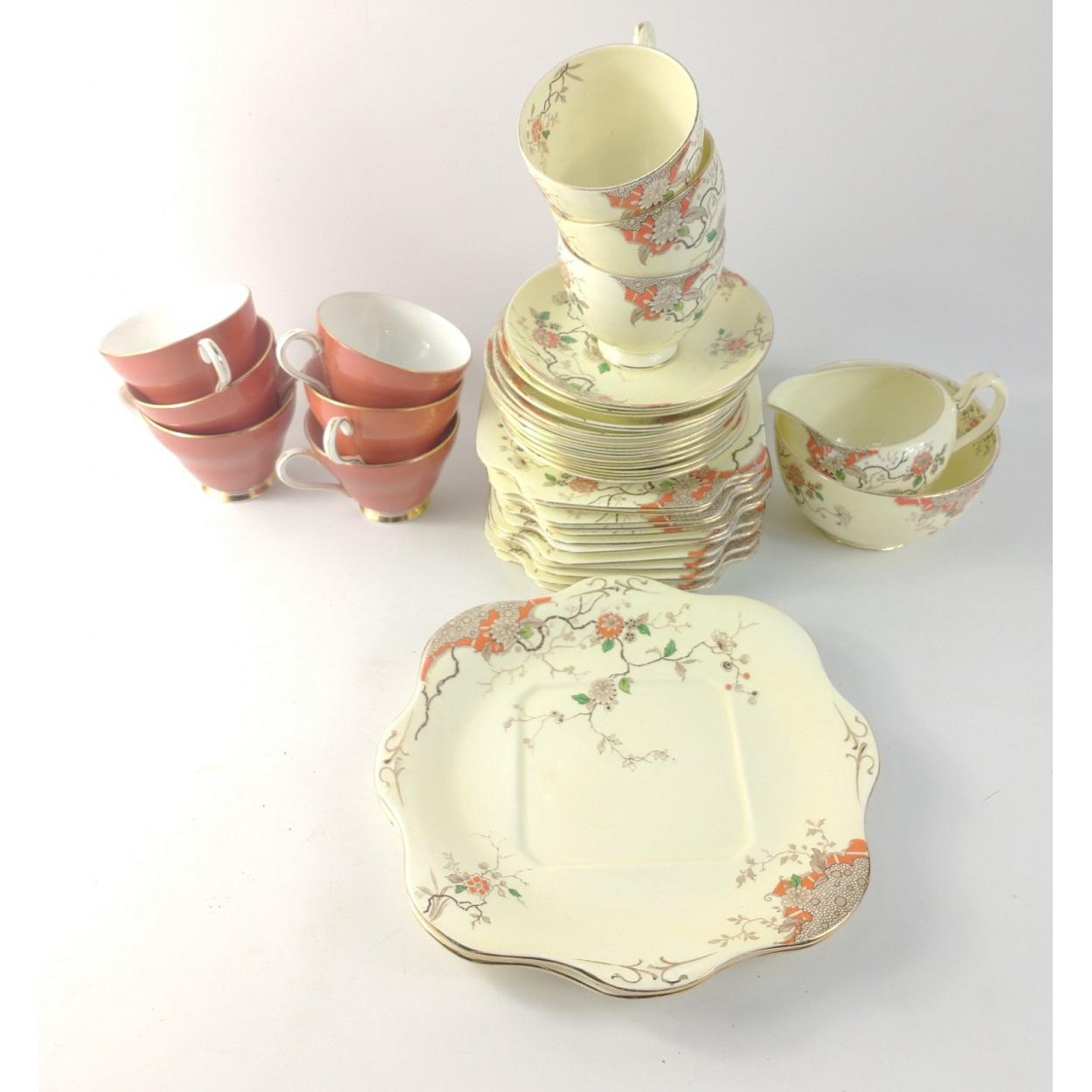 A GRAFTON part tea set comprising two large plates with a sugar and cream, 12 side plates, 11 saucers with three matching cups and six Royal Grafton orange cups that match quite well. 36 pieces in total. Generally good condition, cracked noted.