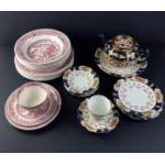 A part VICTORIA porcelain dinner service in the ever popular Willow pattern comprising 6 dinner plates, 5 soup bowls, 1plate dia 20cm, 1 plate dia18cm and 1 sugar bowl. Also a part WELLINGTON tea service to include 1 teacup, 6 saucers, 5 side plates, 1 teapot with underplate. Some wear to the gilding but otherwise good condition