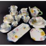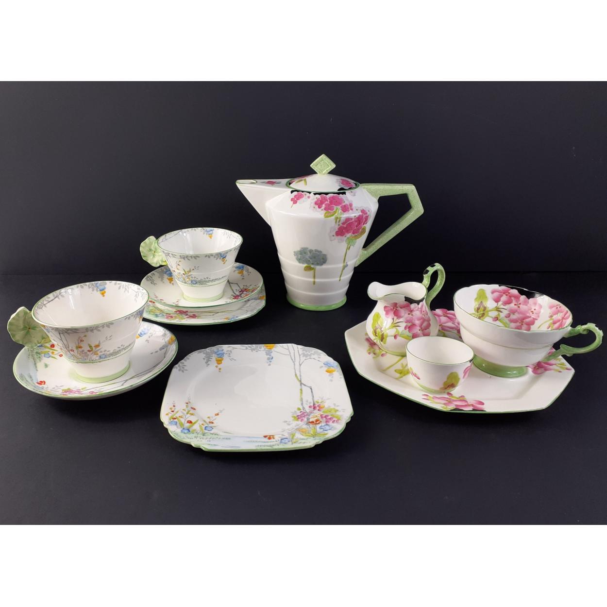 C1930's PARAGON - A most unusual PARAGON (made for WYLIE HILL & Co of Glasgow), 'Geranium' pattern hexagonal plate with inbuilt rests for a milk jug, sugar bowl and cup with matching hand-painted coffee pot plus two PARAGON c1930's Riverside pattern trios. NB Teapot has historical crack and one cup has a crack.