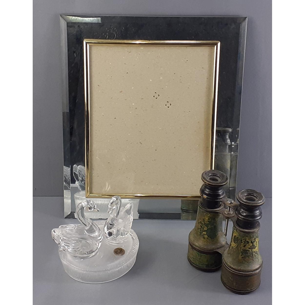 A small mixed lot to include an RCR swan figurine approx 13cm high (no damage), a large free standing photo frame (33 x 28cm approx) and a pair of vintage CHEVALIER OPTICIEN binoculars