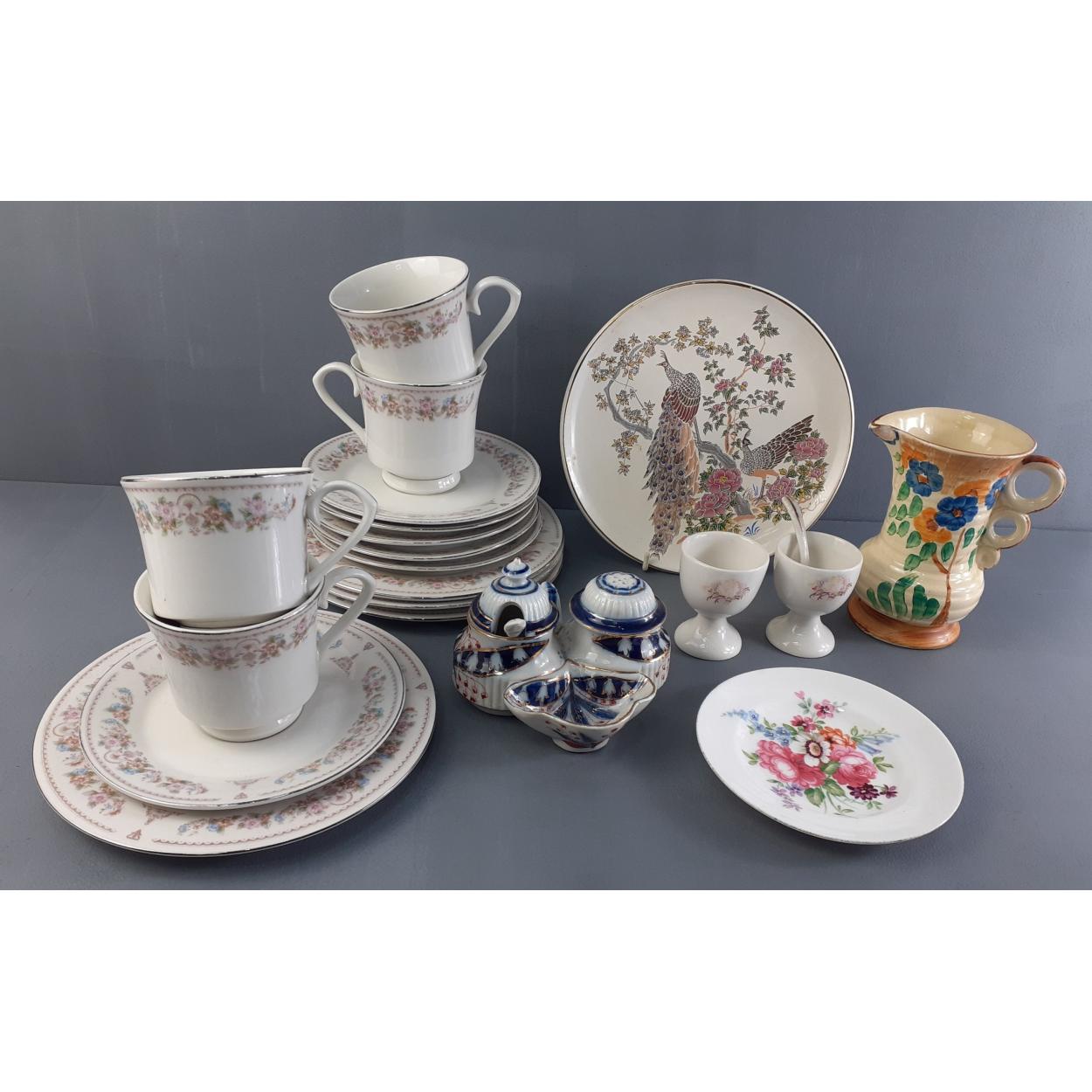 Mixed part dinner service pieces THAILAND pattern by ROYAL PORCELAIN, and other decorative items.