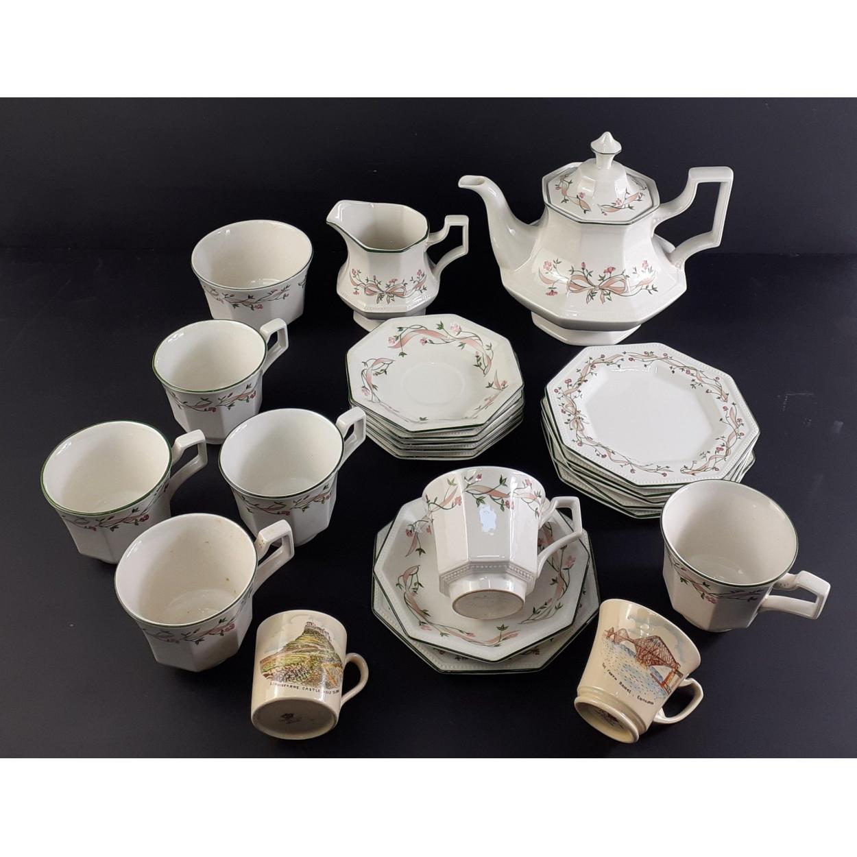 A floral tea service comprising 6 each of cups, saucers and side plates plus a large teapot, sugar and milk. Plus two Crown Devon small coffee cups with images of Lindisfarne Castle, Holy Island and The Forth Bridge, Edinburgh.