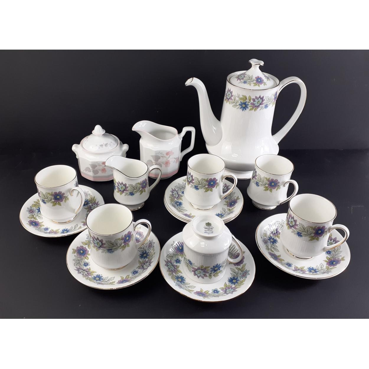 A PARAGON Cherwell coffee set comprising 6 coffee cans, 6 saucers, 1milk jug and 1 large coffee pot plus a Francine milk jug and sugar bowl with lid