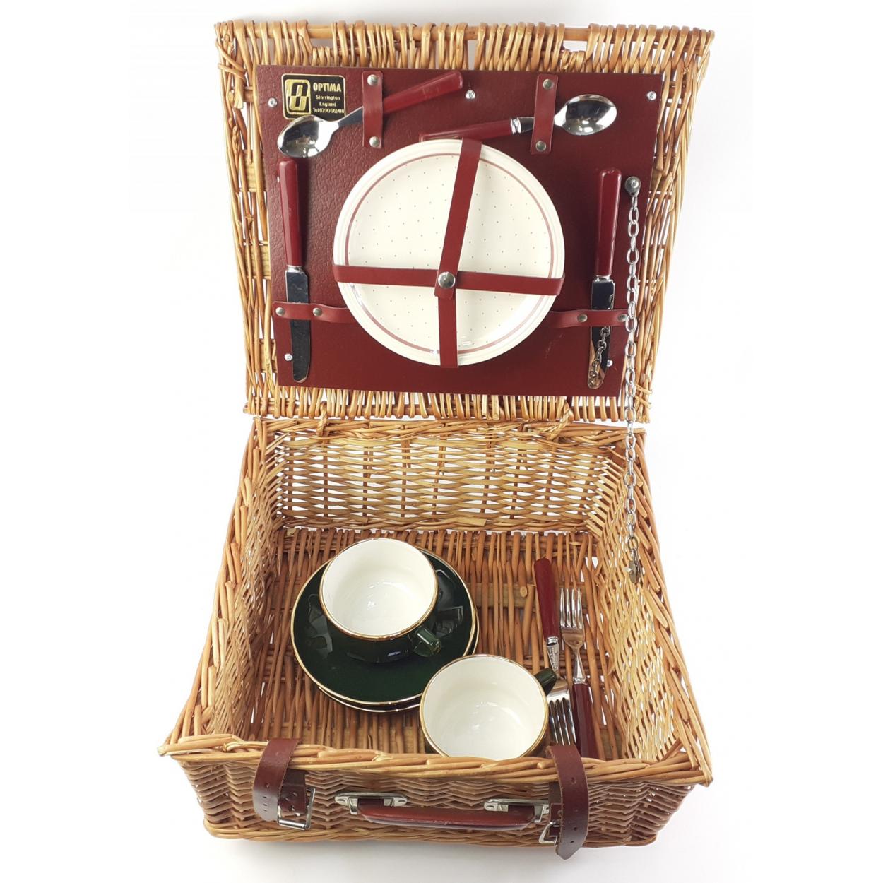 A nice OPTIMA wicker picnic hamper with contents. dimensions 40 x 35cm approx