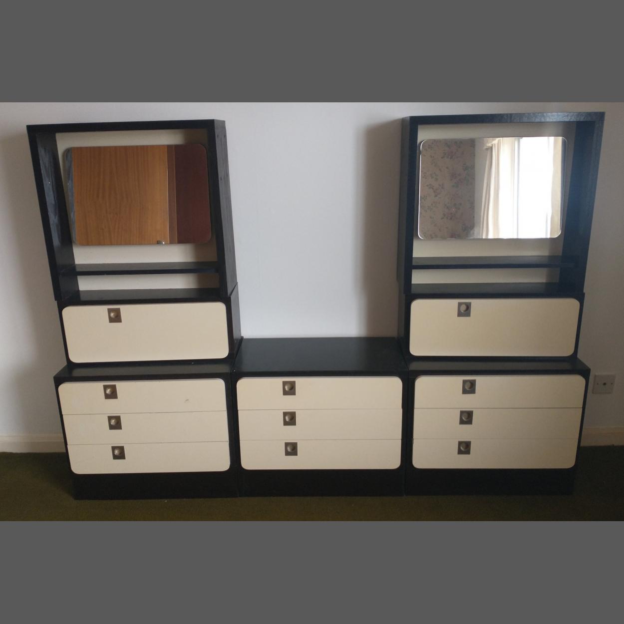C1970's purchased! Retro black and white bedroom unit with mirrors. Comes as modular sections , 3x 3 drawer sections, 2x 1 fold down door section and 2x mirrored section. No maker marks(prob early Schreiber?)