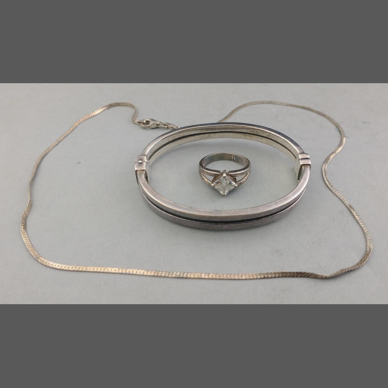 A small silver lot to include a snap-shut bangle, chain (44cm approx), and a ring size Q set with a clear stone. Gross weight 29.4g approx