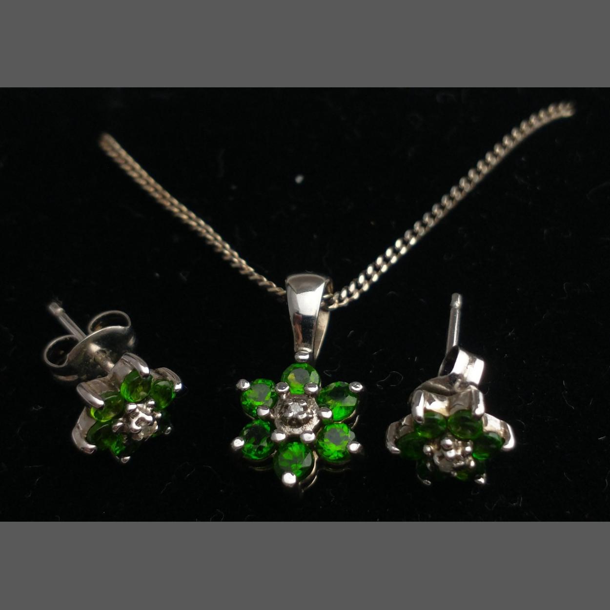 A boxed 925 silver pendant set with 6 green stones surrounding a clear central stone, chain measures 44cm approx. Comes with a matching pair of earrings