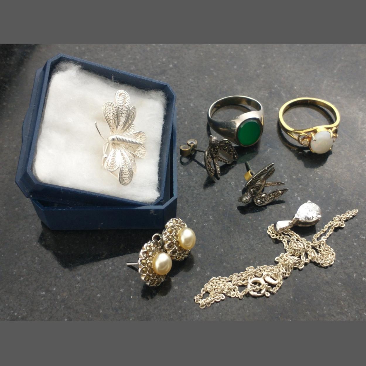 A mixed jewellery lot to include a 925 stamped tear drop pendant on a 925 chain 44cm approx, plus a pair of marcasite swallow earrings, a boxed filigree butterfly brooch (30mm approx), two rings and one other pair of earrings