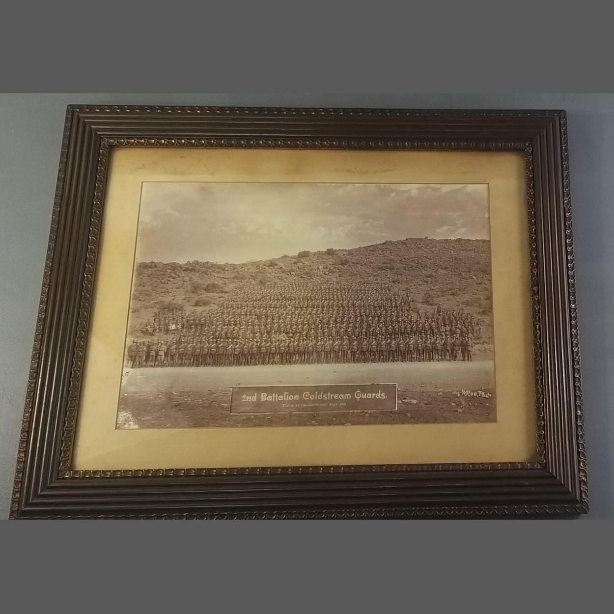 COLDSTREAM GUARDS Boer War interest. A framed original photograph of 2nd Battalion COLDSTREAM GUARDS taken at Graaff Reinet July 1902. Frame size 54 x 44 cm approx