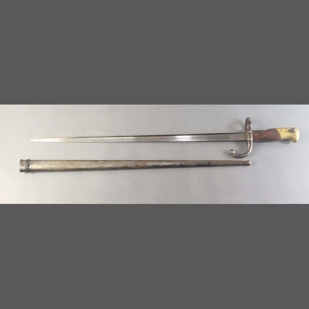 A good example of a French Model 1874 Bayonet – St Etienne 1876. A French 19th century bayonet with brass and wood grip. Dated 1876 on the blade spine and manufactured at St Etienne. Complete with correct metal scabbard. Numerous stamps to bayonet and scabbard as expected