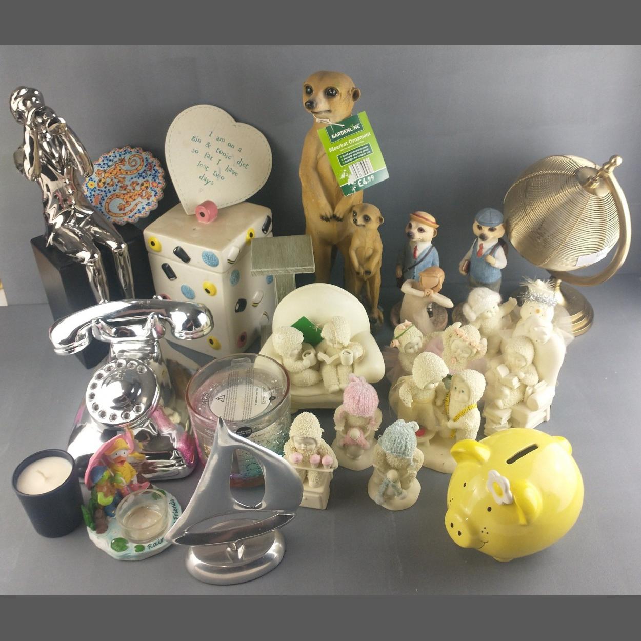 A mixed lot of decorative items to include meerkat ornaments, snowbabies ornaments, liquorice all sorts storage jar etc