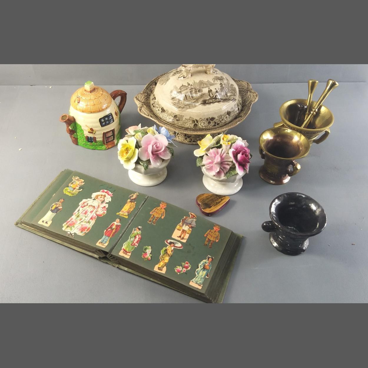 Mixed lot. Comprising china posy vases, brass mortar and pestles, jam pot, Victorian covered dish, MAUCHLINE ware pin cushion