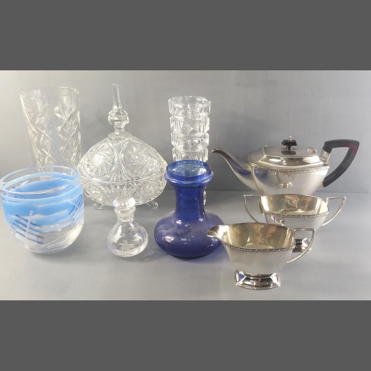 Mixed lot to include a very nice quality EPNS teapot with matching sugar and cream. Etched to base Edinburgh Crystal 23cm vase, one other vase and lidded glass jar and others.