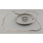 A small silver lot to include a snap-shut bangle, chain (44cm approx), and a ring size Q set with a clear stone. Gross weight 29.4g approx