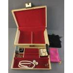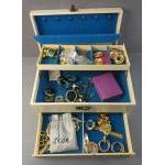 A cream 2-tier jewellery box with some contents. Hinge needs attention
