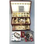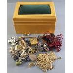 A wooden jewellery box with velvet 'pin cushion' lid complete with jumble of costume jewellery. Box measures 20x14x10cm approx