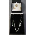 A bright and shiny pendant (20mm) with chain 46cm chain (has magnetic extender chain) and a matching pair of earrings and a necklace 50cm long set with 14 opals interspersed with clear stones and a matching pair of drop earrings each with 3 opals and clear stones