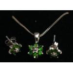 A boxed 925 silver pendant set with 6 green stones surrounding a clear central stone, chain measures 44cm approx. Comes with a matching pair of earrings