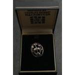 A Capstan Deco style STERLING SILVER desk inkwell BIRMINGHAM 1933. Weighted base, gross weight 590g approx, 15cm diameter approx. Retaining glass ink well hallmarked to base and cover