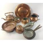 A box of copper kitchen ware items as well as decorative tray comprising four graduated frying pans, kettle, cauldron, fondue pot and others as well as a 34cm copper tray.