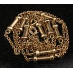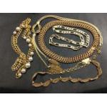 A shiny collection of yellow metal costume necklaces. Five pieces in total.