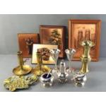 A mixed decorative metal ware lot consisting of small brass candle sticks, brass urn, decorative plaques and silver plated tableware pieces. All in good order.