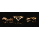 Earrings 375 hallmarked and a 9ct gold wishbone ring with three small stones. Gross weight 2.6g approx.