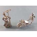 A wonderful and scarce CHESTER hallmarked small character piece of winged cherub pushing barrow. Hallmarked 1898 Chester with BERTHOLD MULLER maker's mark. 6cm long approx 27.4g approx. A very unusual and desirable piece. Comes with another similar unmarked item of a lady with rake.