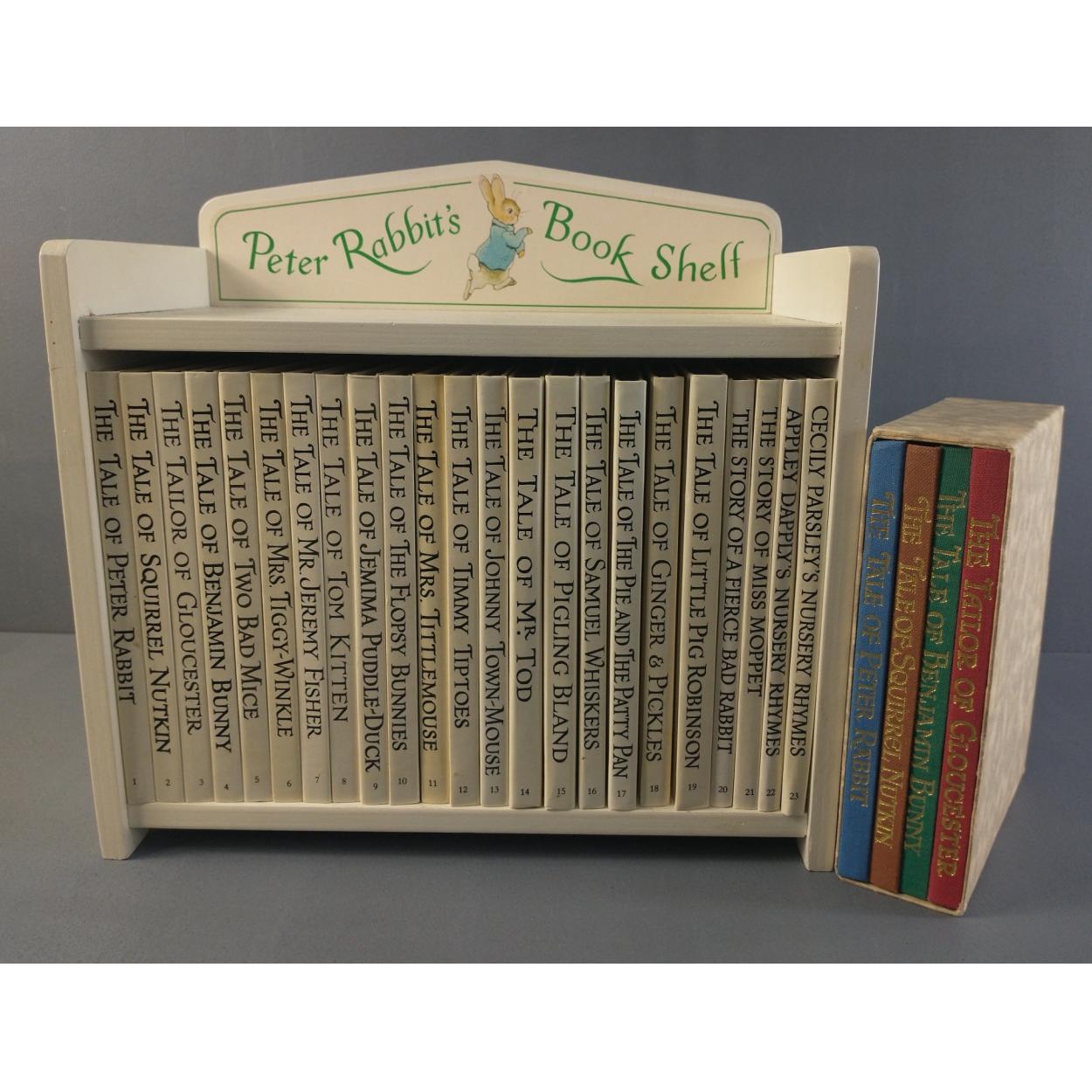 A vintage PETER RABBIT book shelf with 23 volumes of Beatrix Potter's tales plus a gift set of four titles in slip case with gold lettering