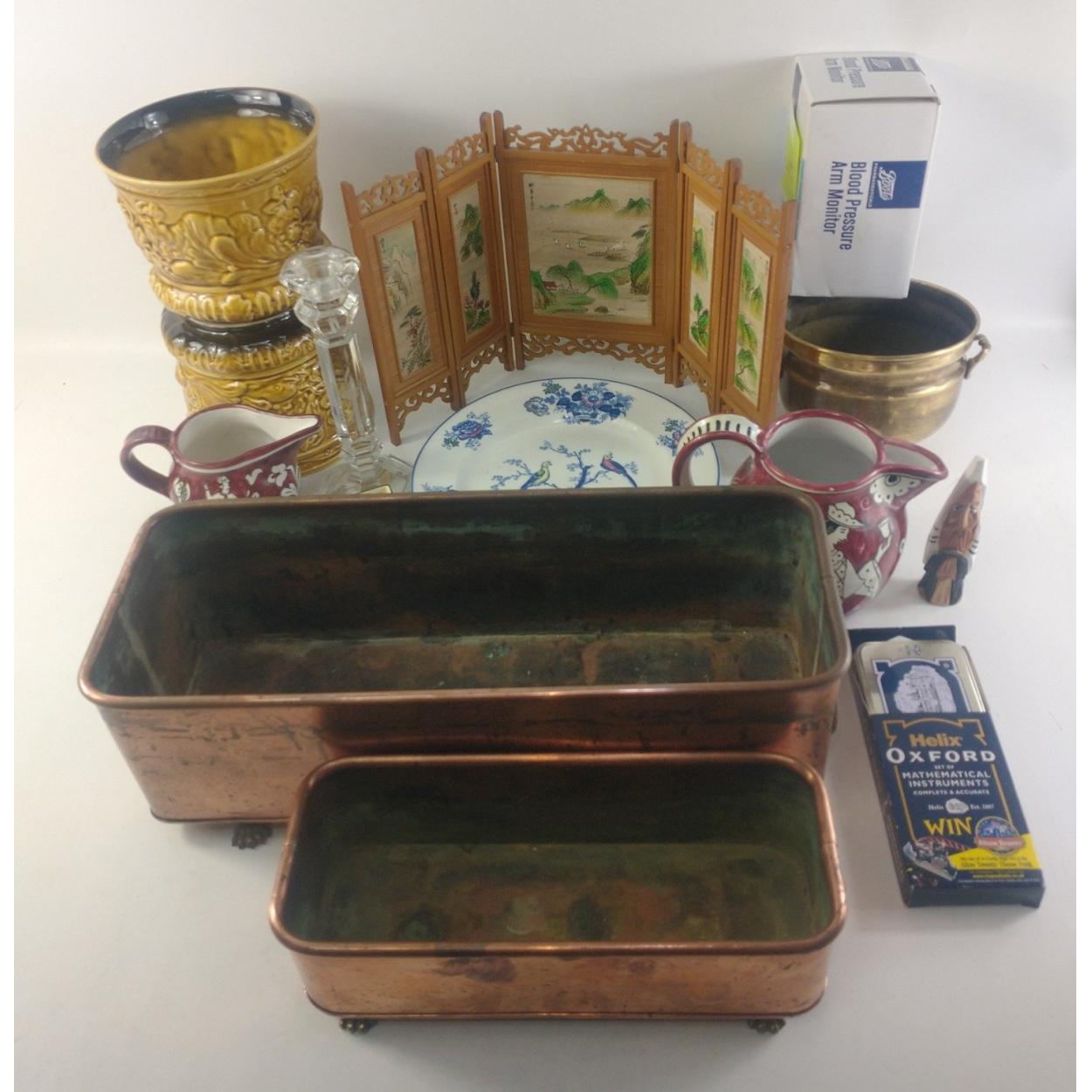 A mixed lot to include two copper planters, two SYLVAC plant pot holders, blood pressure monitor, plates and others.