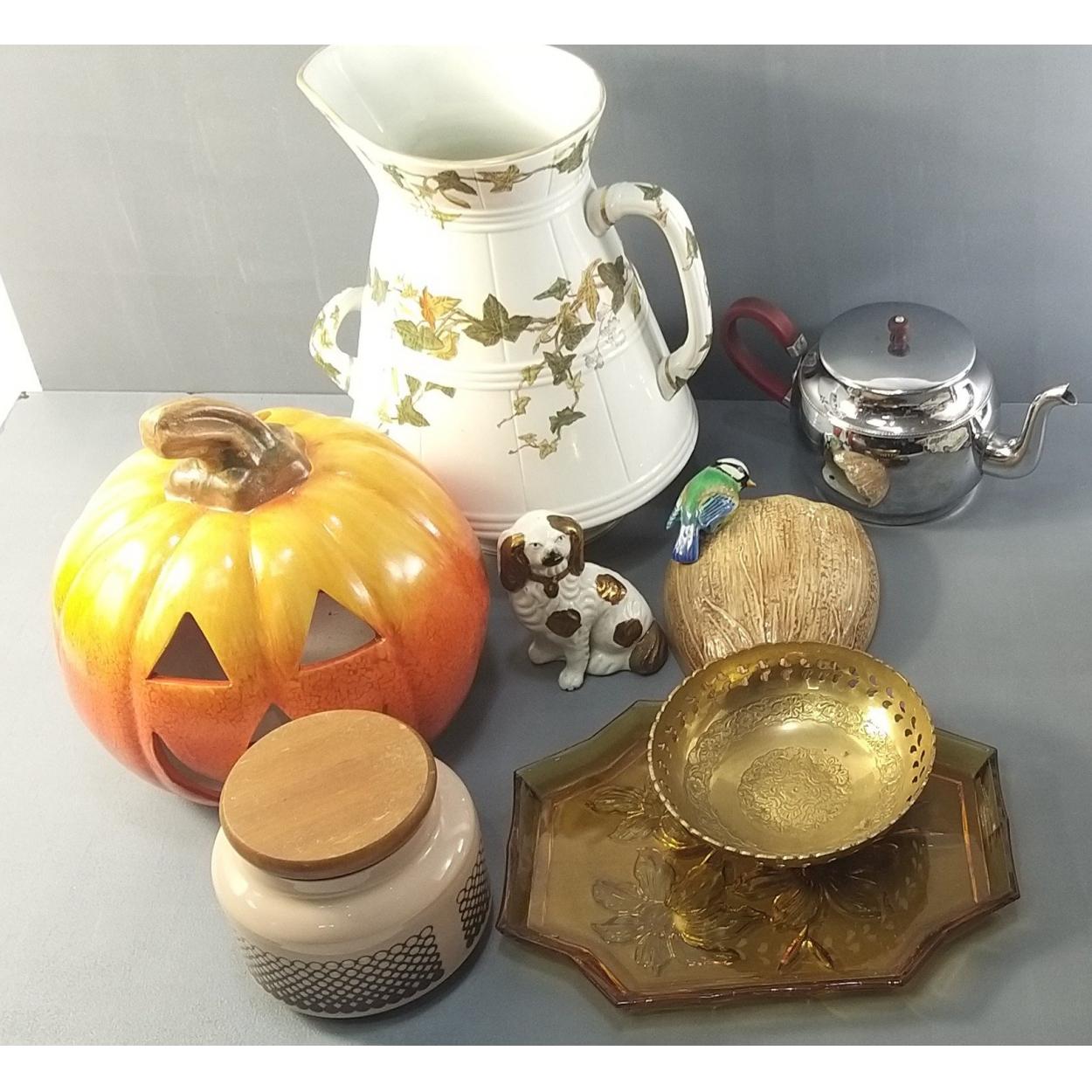 A mixed lot. A large ceramic pumpkin, a pretty modern water ewer and others.