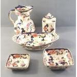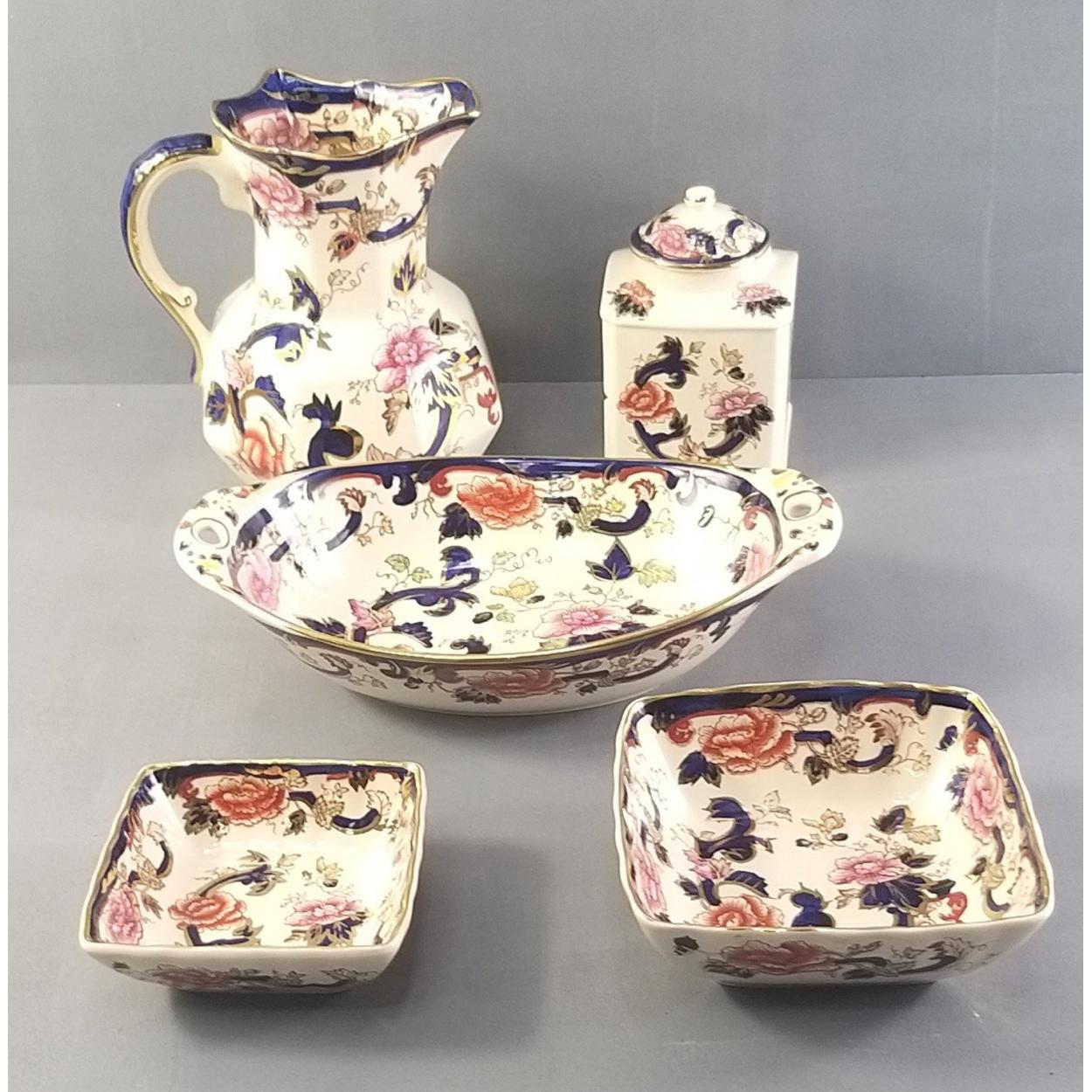 Lovely collection of five ANTIQUE MASONS IRONSTONE pieces, all in good condition with no chips or cracks. All MANDALAY pattern. Comprises jug 17cm, dish 26cm both approx, two other trays and a lovely tea caddy. A good collection of these collectible pieces.