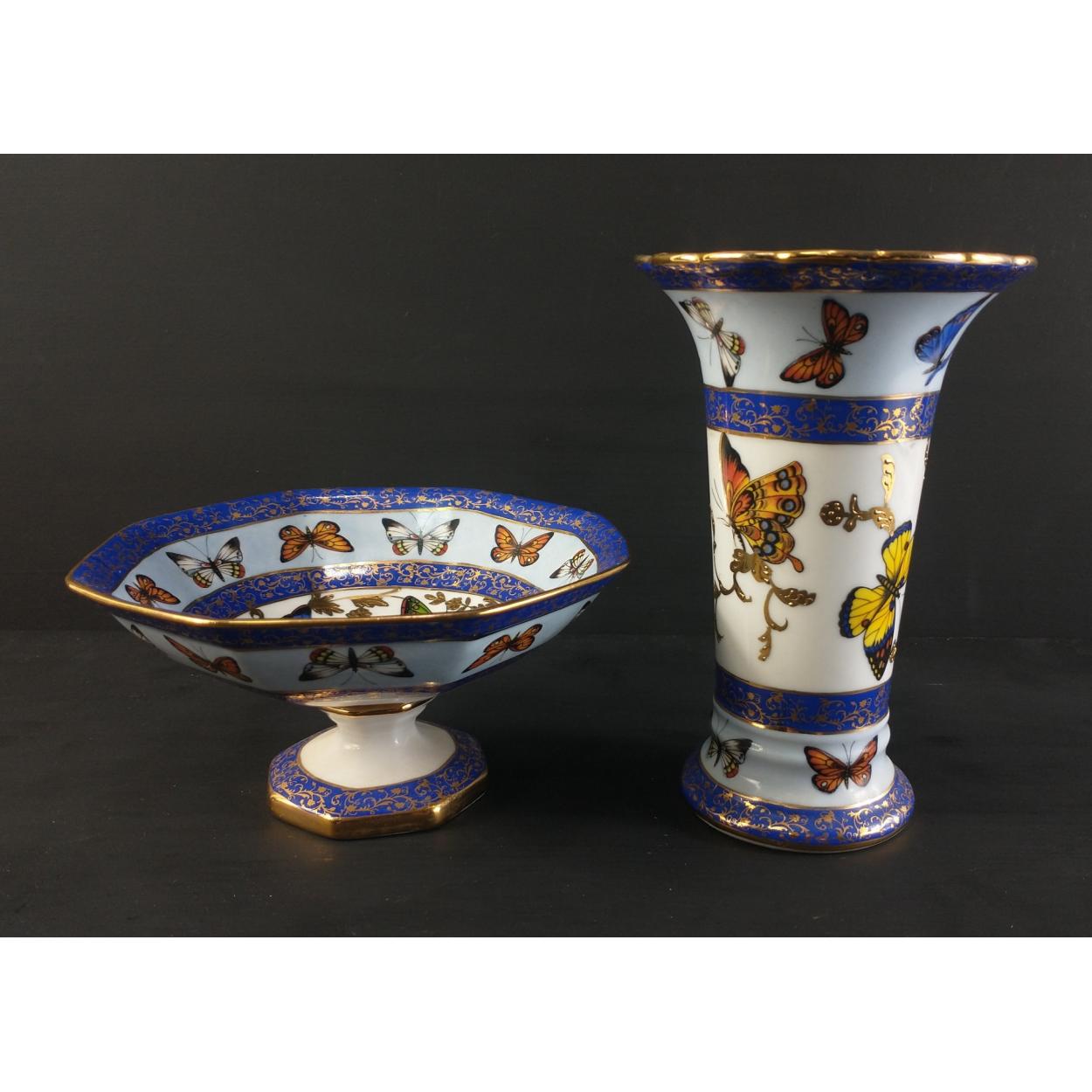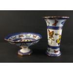 Two pieces of ROYAL ASHMORE ware decorated with butterflies and gilt highlights, to comprise a vase 15cm approx and a small footed bowl (15cm dia)