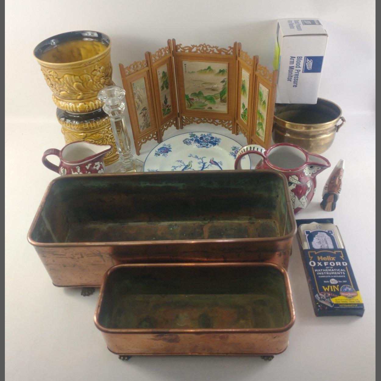 A mixed lot to include two copper planters, two SYLVAC plant pot holders, blood pressure monitor, plates and others.